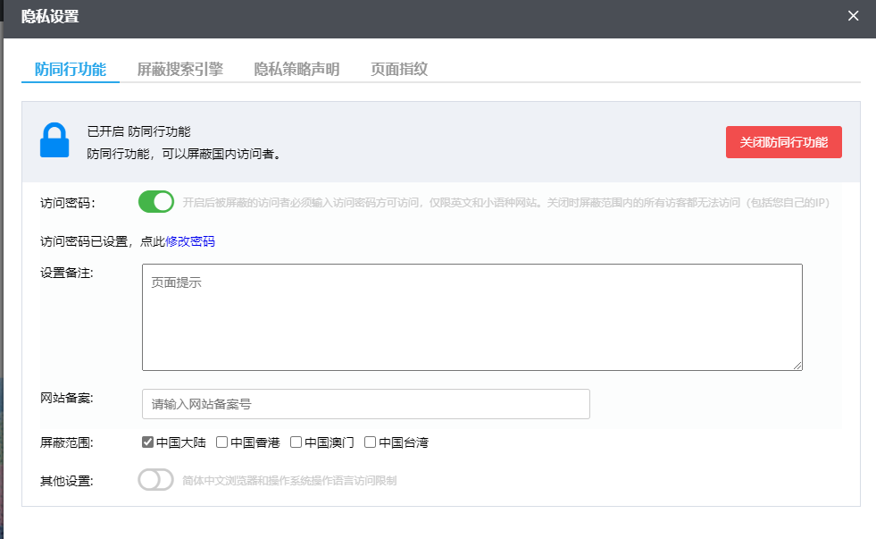 “其他设置”(是针对简体中文浏览器和操作系统操作语言访问限制,作用是可以更大限度和强度的防国内用户访问的目的)