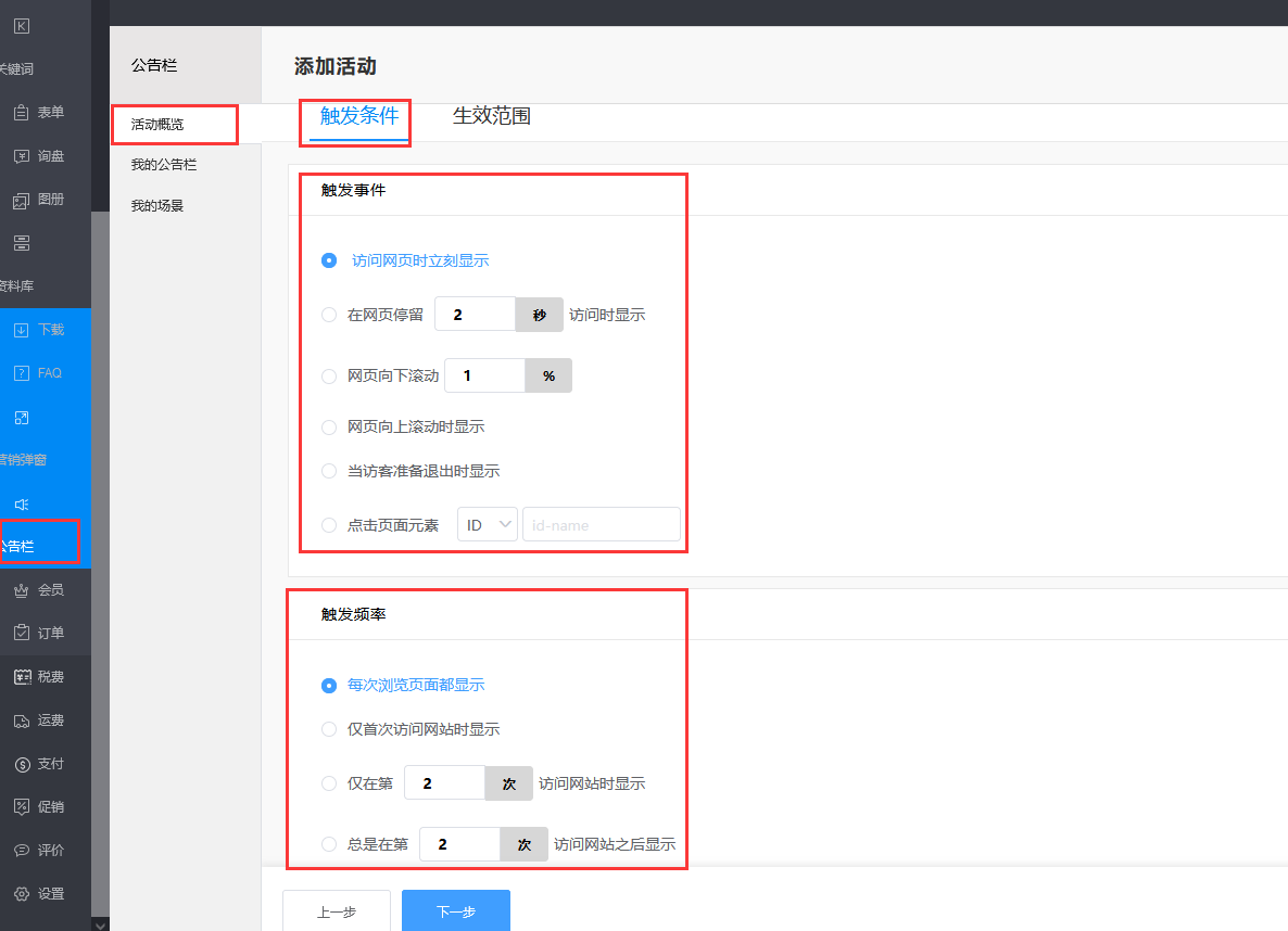 “活动”定义:由公告栏、触发场景组合而成,当访客浏览网页,符合触发场景中的设定时,系统会自动展示指定的公告栏。针对不同的营销活动,可以设计不同的公告栏样式、设置不同的触发场景。