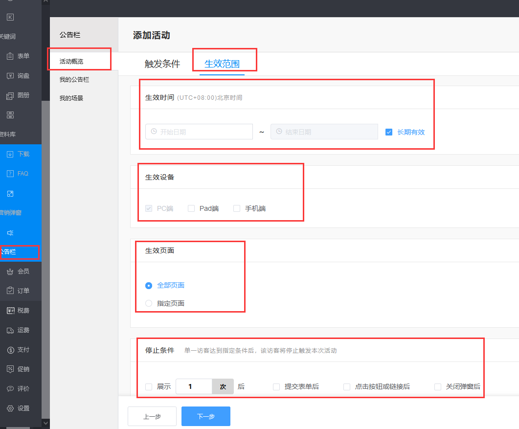 设置该活动的开始时间、结束时间(可以设置“长期有效”,即该活动无结束时间,永久有效),只有在时间区间内活动才能生效。