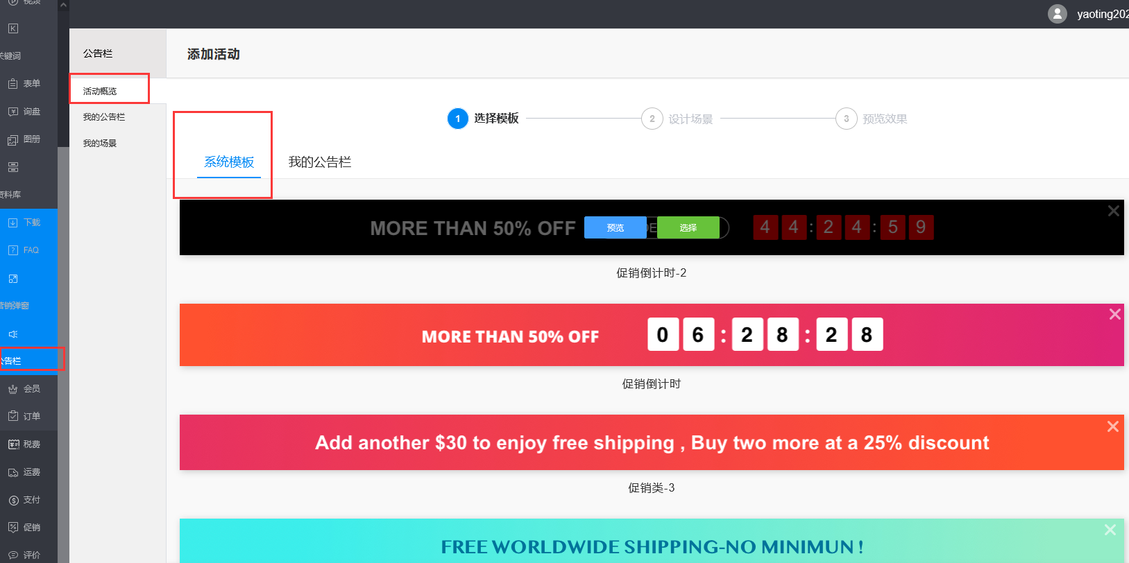 添加活动第一步就是选择模版,可以选择系统设置好的活动模版,或者是从“我的公告栏”中选择自己事先设计好的“专属”模版。