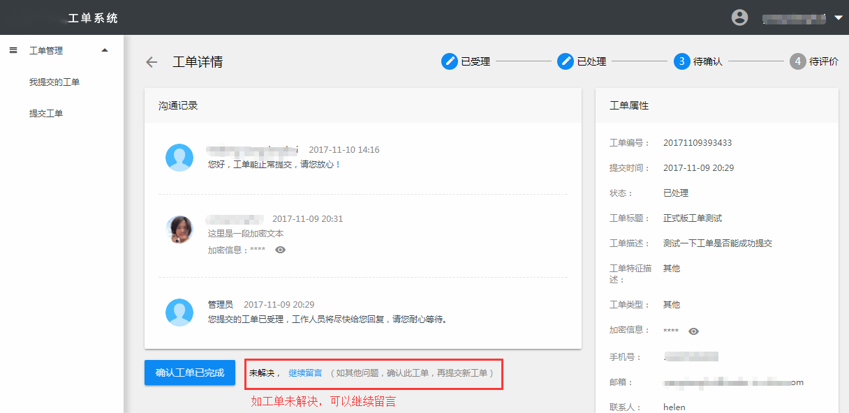 执行【继续留言】操作后,工单状态会由“待确认”变成“处理中”,工单又返回到客服人员,需要客服人员继续处理。