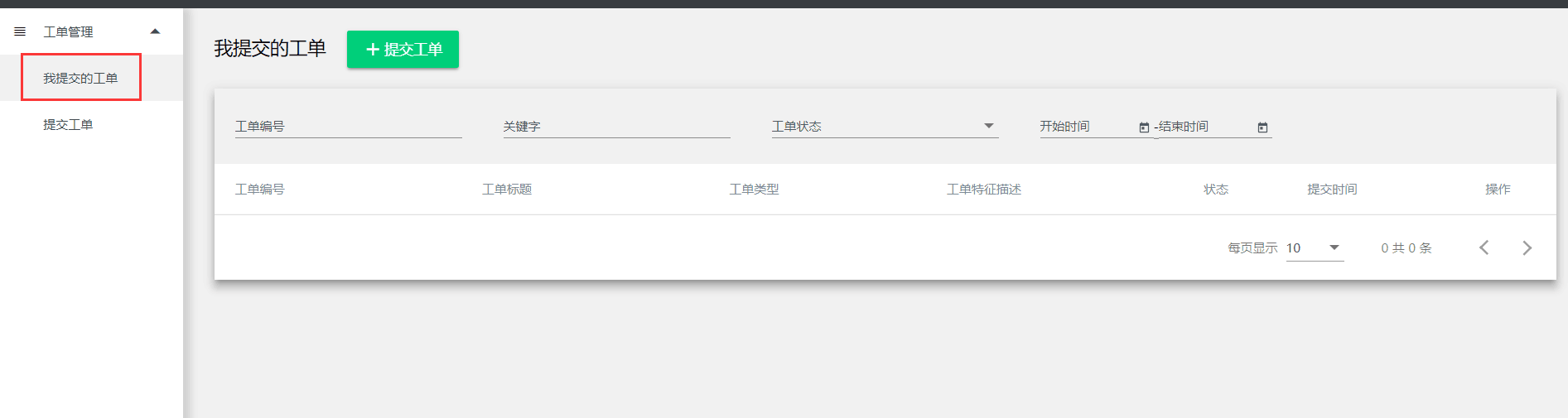 用户登录后,在会员中心下拉菜单中可以看到“工单系统”的入口,点击进入,点击左侧菜单-》工单管理-》我提交的工单,可以查看所有我提交的工单列表。