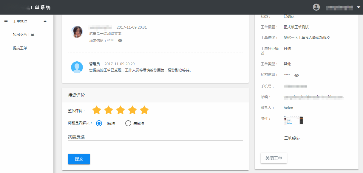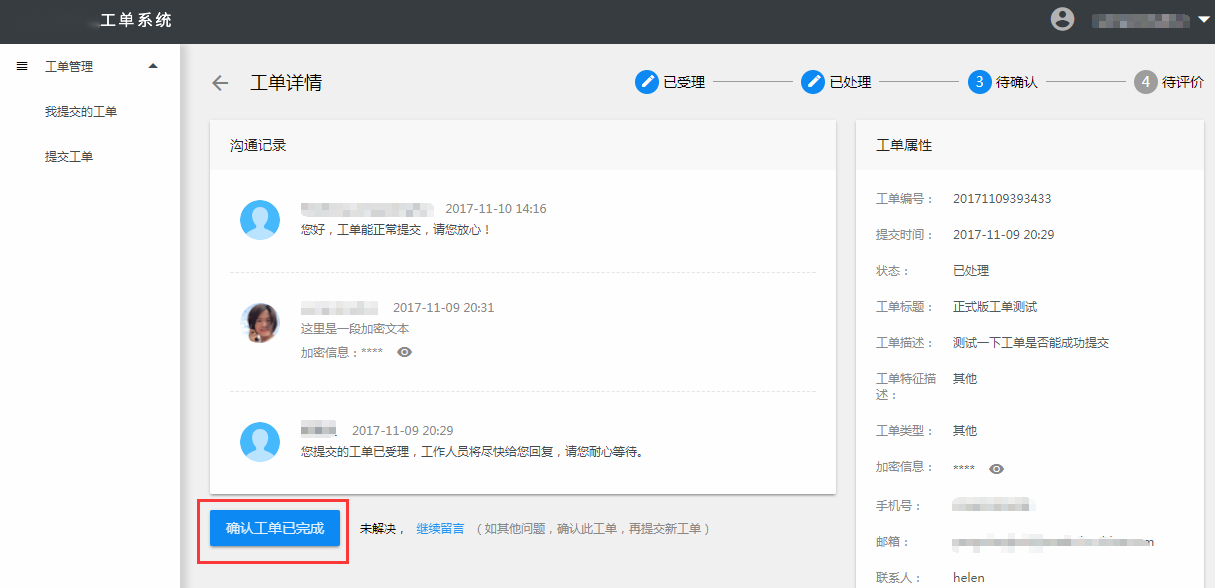 当客服人员处理了工单信息后,就需要用户进行确认操作,如果用户进入对应的工单详情,发现工单已处理完成,就可以执行【确认工单已完成】操作,如下界面界面所示: