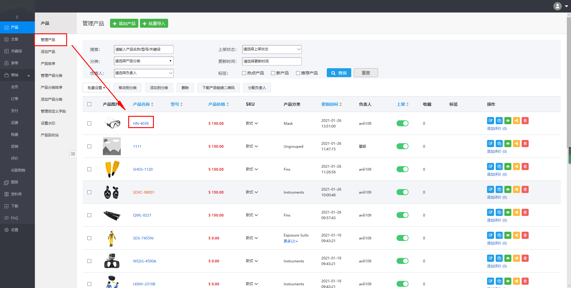 Step1:首先需要进入产品管理的页面,步骤为:点击页面左侧的“内容”栏,然后点击第一个“产品管理”