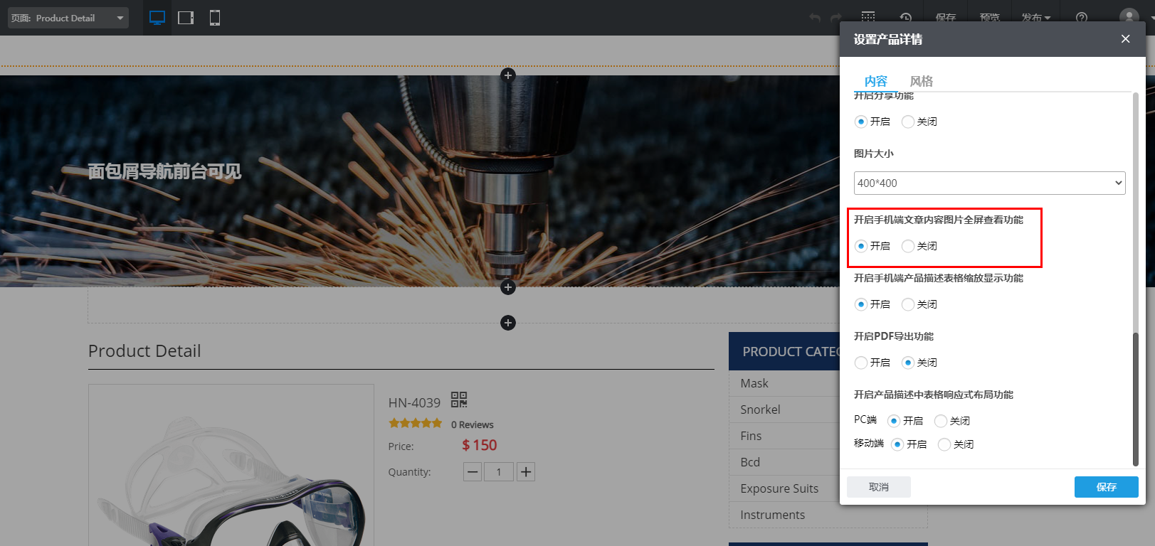 Step7:在弹出的“设置产品详情”页面中下滑找到“开启手机端文章内容图片全屏查看功能”,点击“保存”按钮之后再点击菜单栏中的保存。之后您需要保存网站并发布网站哦!