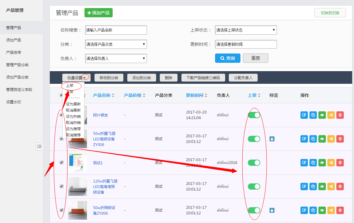 第2步:勾选需要显示在网站上的产品,可以通过“批量设置”按钮批量操作上架,也可以通过“上架”下的拖动按钮来操作,变绿色即为上架状态。