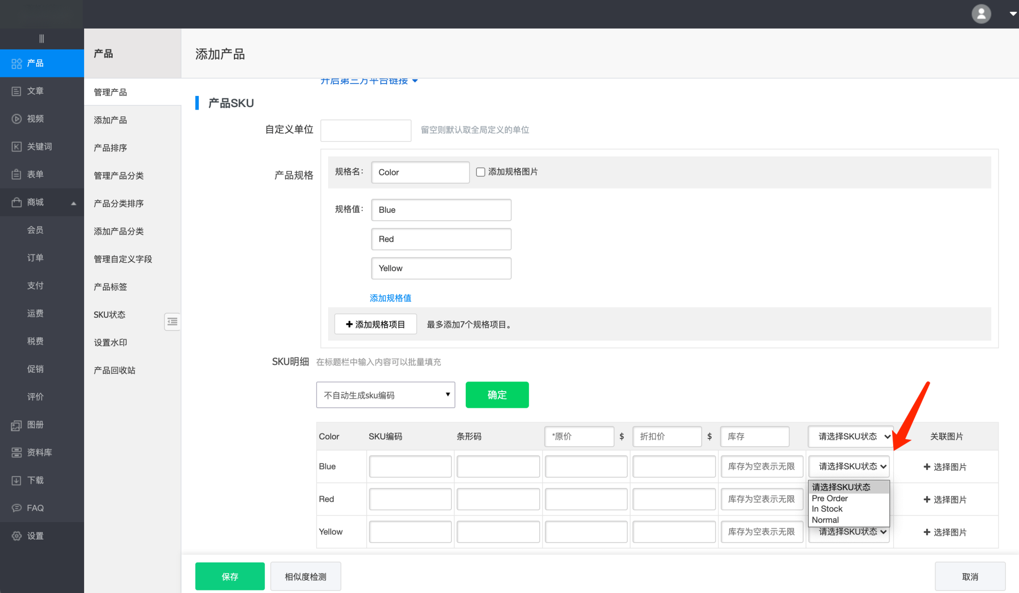 (3)在产品编辑页,可以在SKU规格列表中为其添加SKU状态;