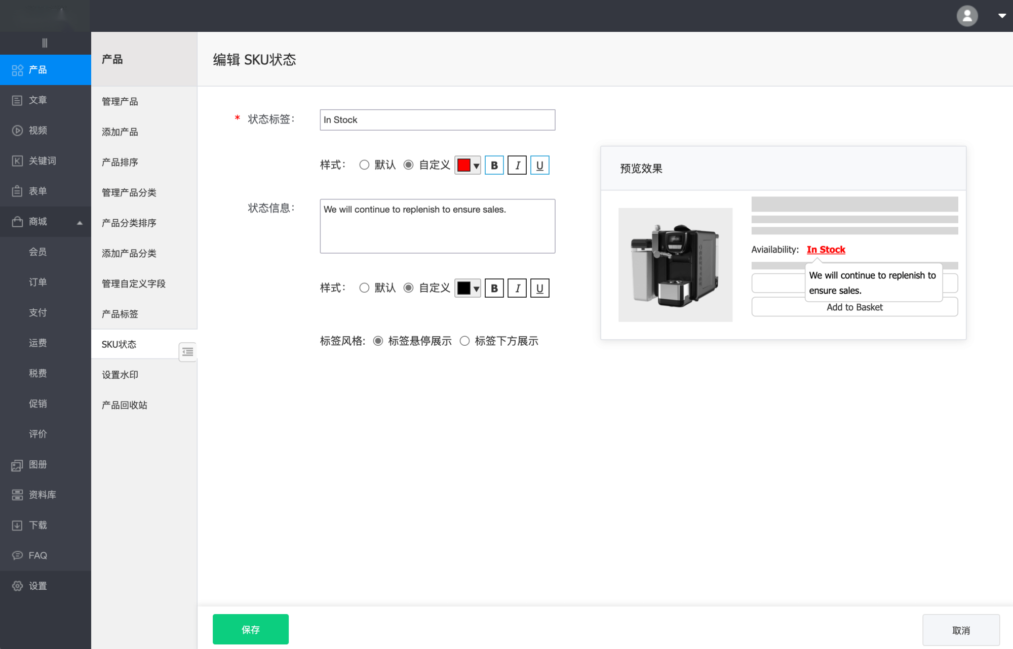 (2)点击“添加SKU状态”按钮,进入编辑页面,可以设置标签、状态信息以及样式;