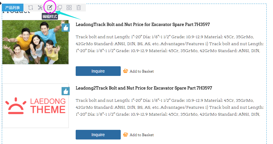 1、以产品列表组件为例,把鼠标放到这块内容区域,出现此组件名称“产品列表”,把鼠标放到这产品列表这四个字上,出现一排安排,单击“编辑样式”按钮;