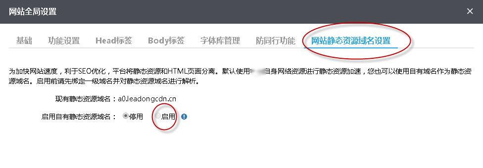 单击:设置--》网站全局设置--》网站静态资源域名设置,可以看到如下界面,再单击“启用”按钮;