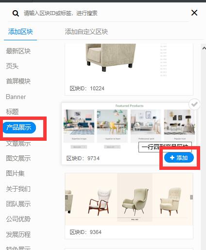 在区块分类中选择“产品展示”区块,首先,需要添加区块,如下图: