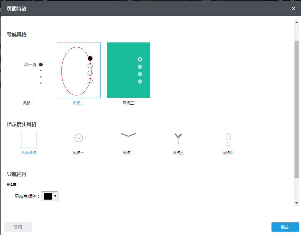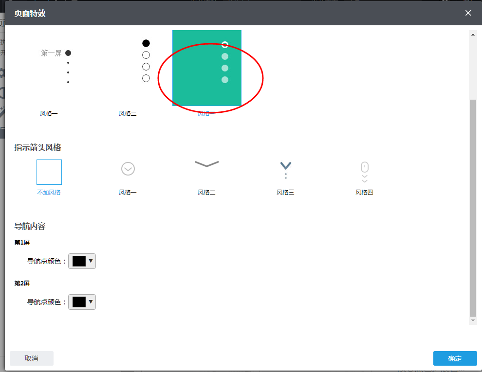 3、在”页面特效“设置窗口,您可以开启“多屏滚动效果”页面特效。