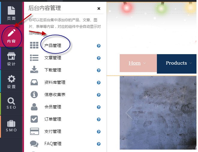 第1步:单击“内容”---》“产品管理”,进入产品管理页面;