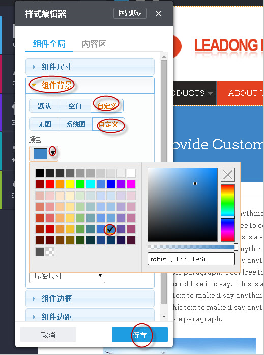 第二步:在弹出的“样式编辑器”窗口,单击“组件背景”》“自定义”》“自定义”,选中某种颜色,单击“保存”。