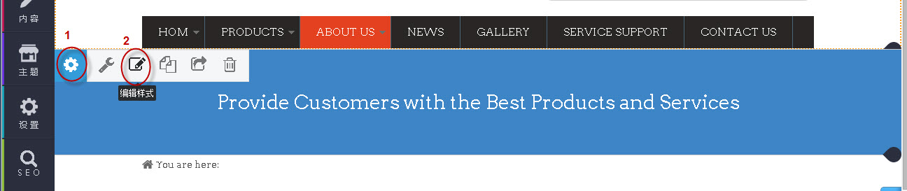 第一步:把鼠标放到内容区域,此文本组件的左上角出现齿轮装图标,把鼠标放到齿轮装图标上,右侧出现一排按钮,单击“编辑样式”;