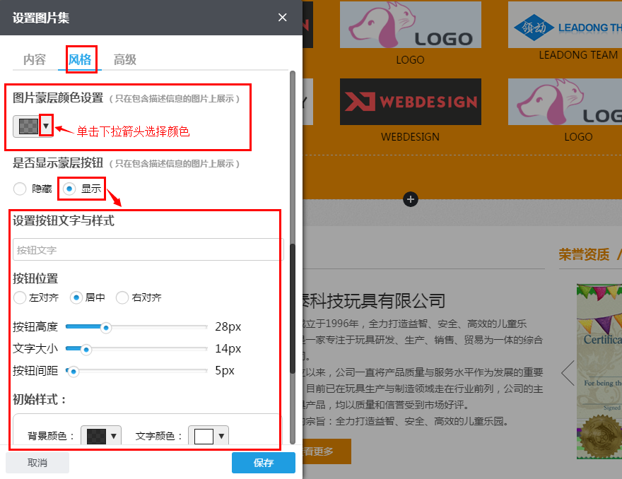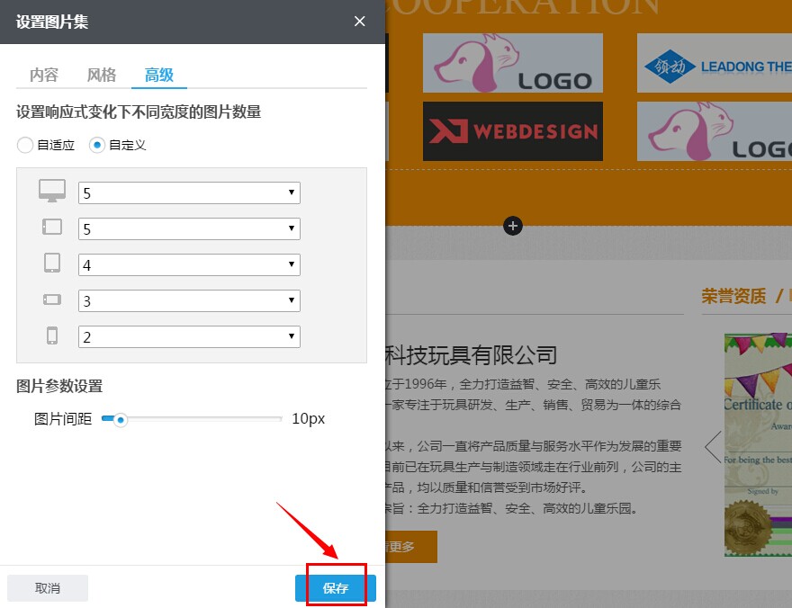 3.5 设置好图片集组件的内容、风格和高级功能后,单击设置框右下方“保存”按钮,以保存所设置的内容。