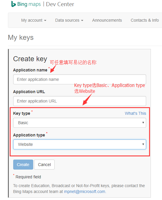 3.在 “My Keys” 中 “Create Key” ,同时填写您应用程序的相关信息。注意密钥类别选择 “Basic”,应用程序类型填写“Website”,然后点击“Create”;