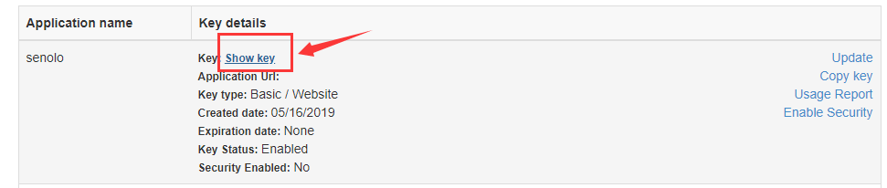 4.生成密钥后,点击“Show key”即可显示密钥,复制下来添加到网站后台的bing地图组件里即可。