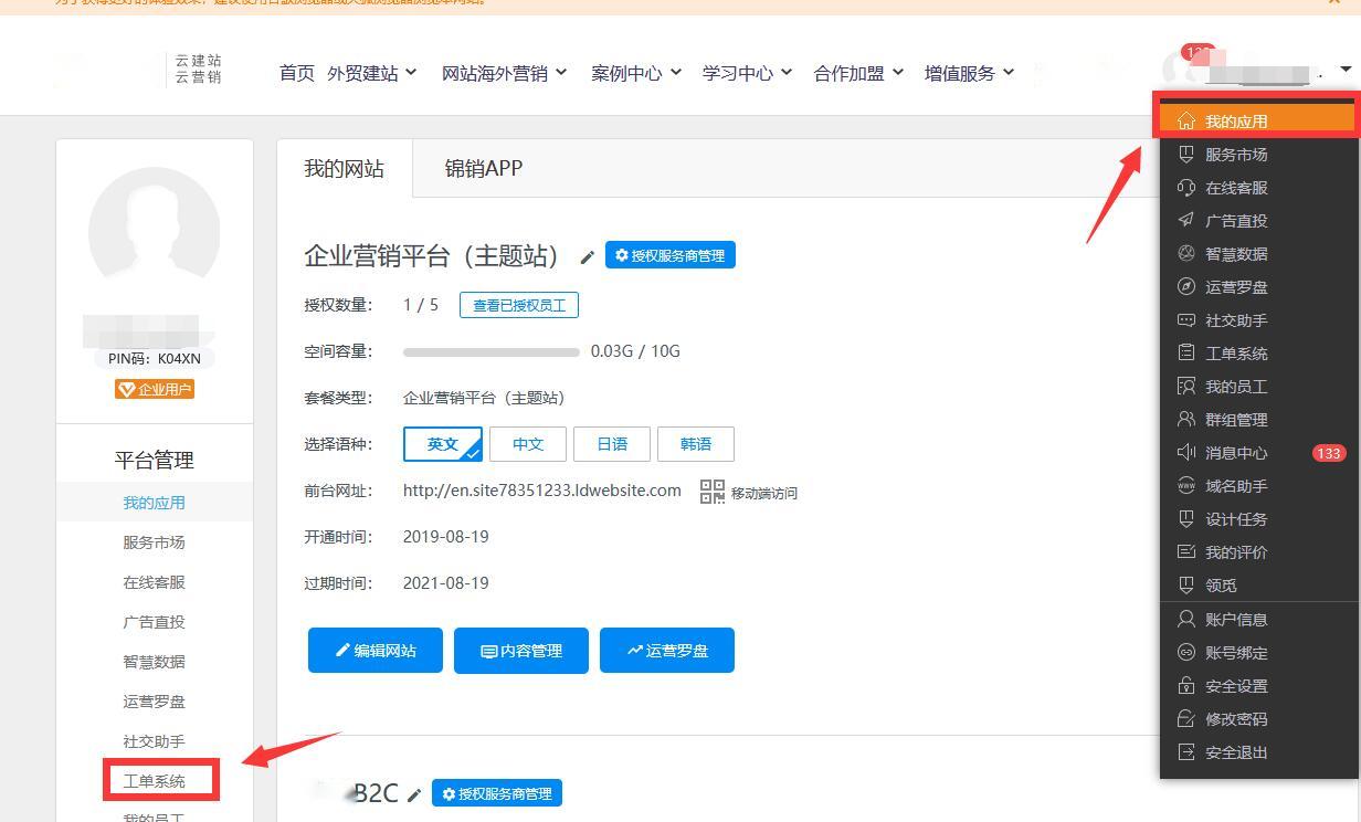 第一步:使用您的账号密码通过sdzhidian.net登录,登录后点击“我的应用”后在中台界面左边竖着的菜单栏点击“工单系统”