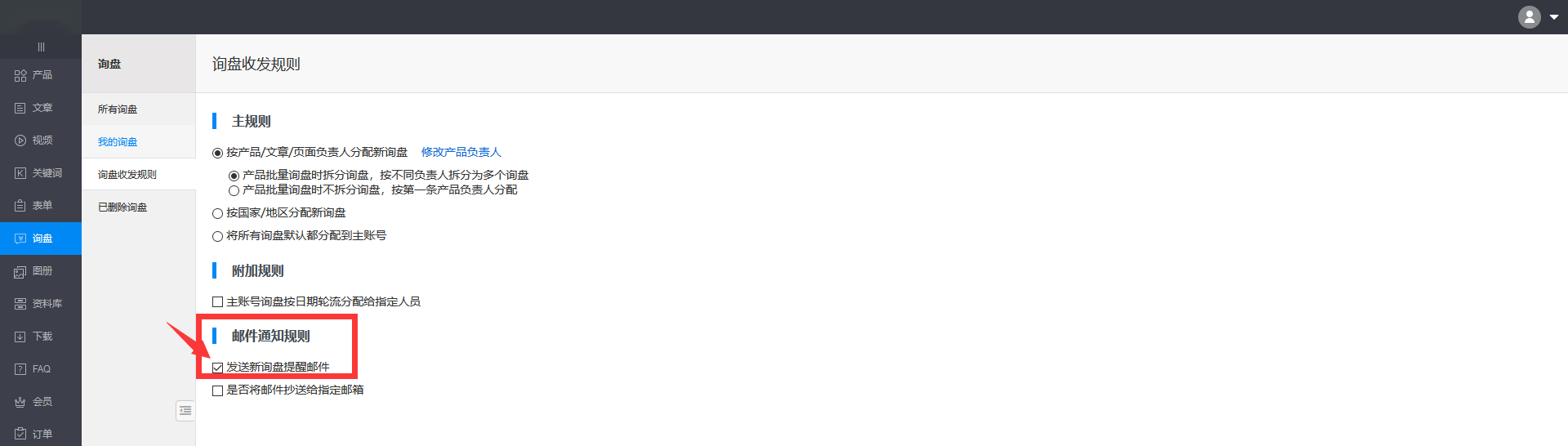 如果是需要有询盘邮件提醒的,请记得勾选邮件通知规则中的“发送新询盘提醒邮件 ”哦!