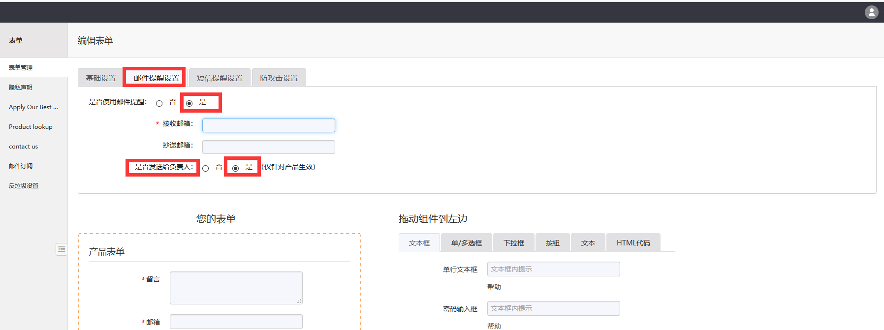 另在产品表单中,开启邮件提醒,输入接收邮箱,“是否发送给负责人”选择“是”,如下图: