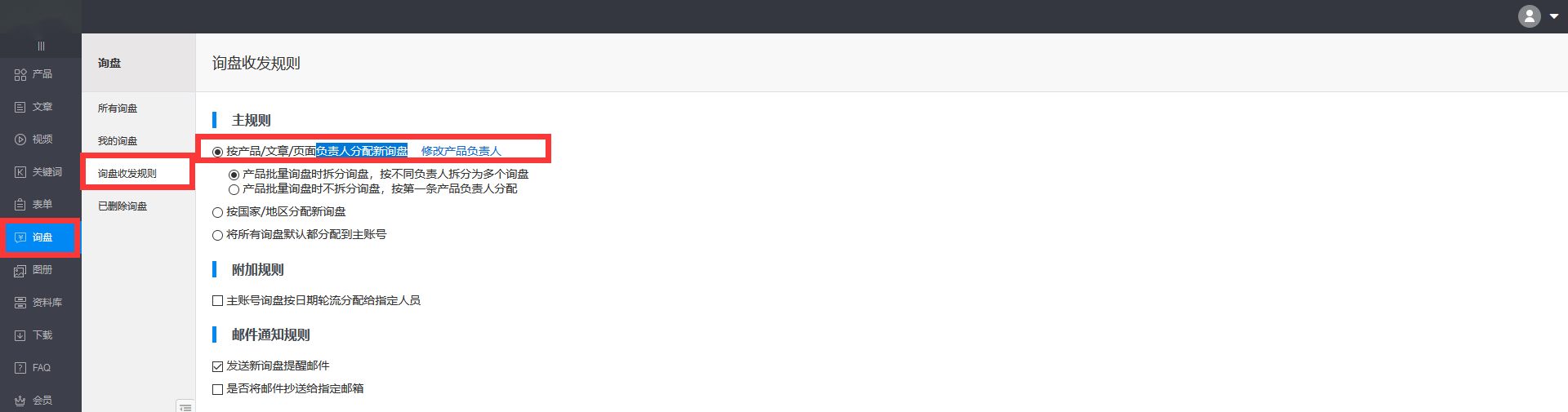 首先进入到内容管理--询盘管理中,点击询盘收发规则,选择主规则“按产品/文章/页面负责人分配新询盘”,然后按需勾选“ 产品批量询盘时拆分询盘,按不同负责人拆分为多个询盘 ”或者“产品批量询盘时不拆分询盘,按第一条产品负责人分配”,如下图: