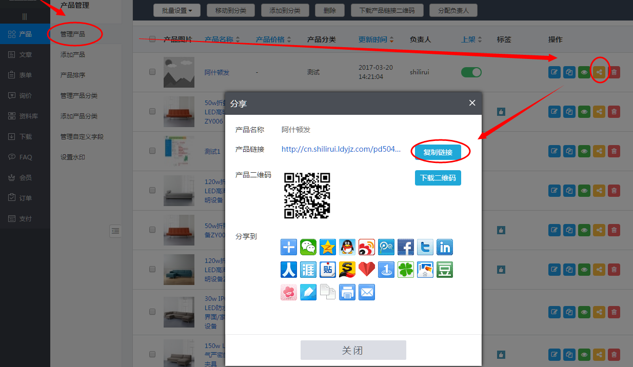 2、找到要查看的某条产品,单击这条产品后面的分享按钮,出现分享弹出框,然后单击“复制链接”即可复制这条产品的网络访问地址,然后根据需要来应用就可以。