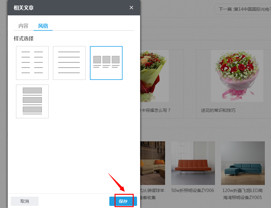 3.4 设置好相关文章组件的内容和风格后,单击设置框右下方“保存”按钮,以保存所设置的内容。
