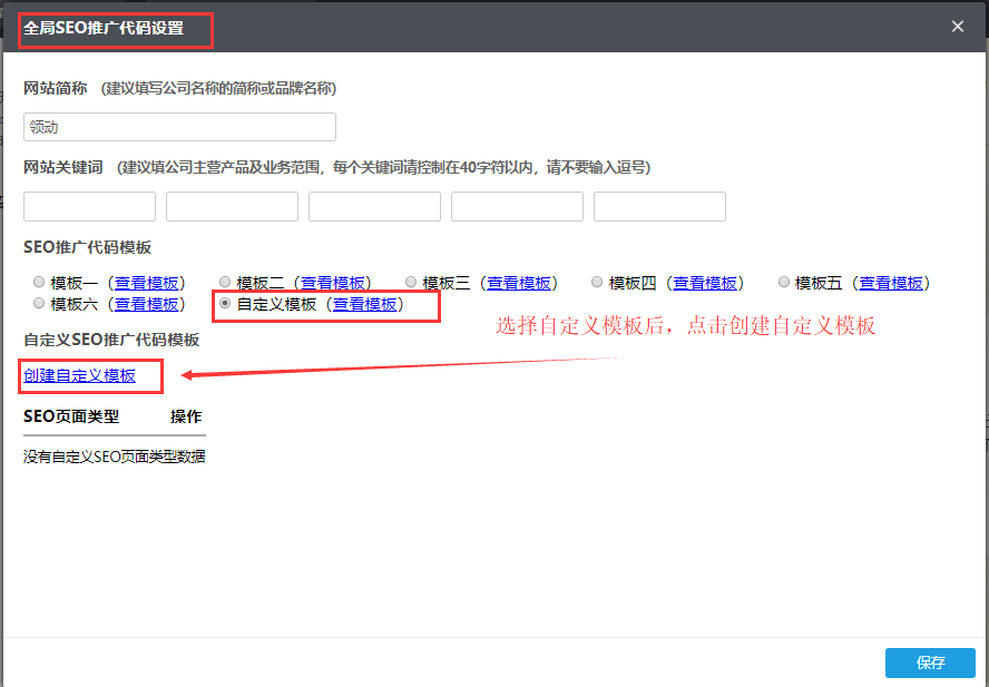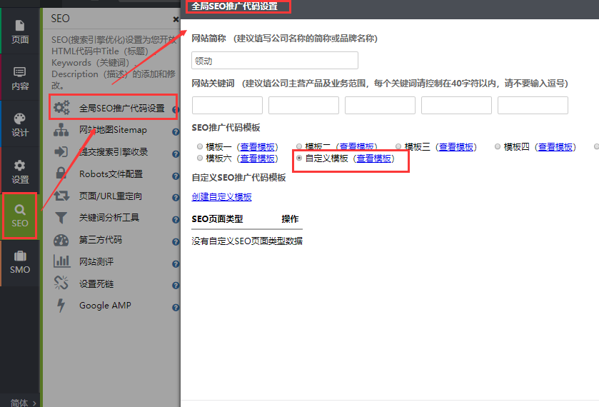 (2)新增模板的操作入口:编辑网站->SEO->全局SEO推广代码->全局SEO推广代码设置中选择自定义模板->点击创建;