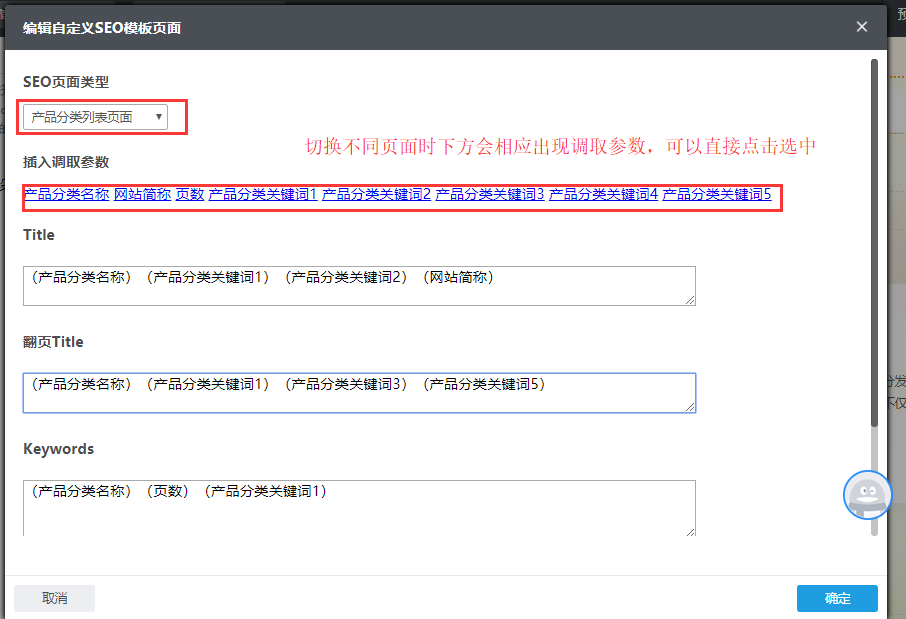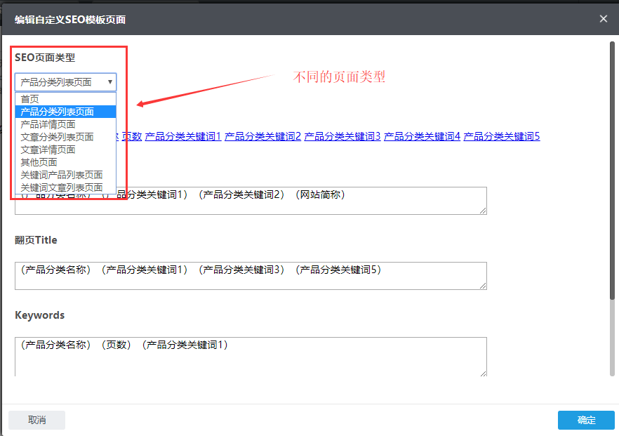 以SEO代码模板一为例,查看一下各页面SEO标签生成的规则: