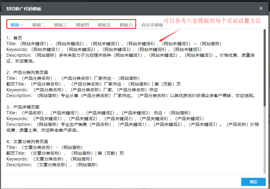 自定义模板可以参考已提供的SEO的六套模板进行设置并结合自身公司业务推广需要进行相应的局部修改: