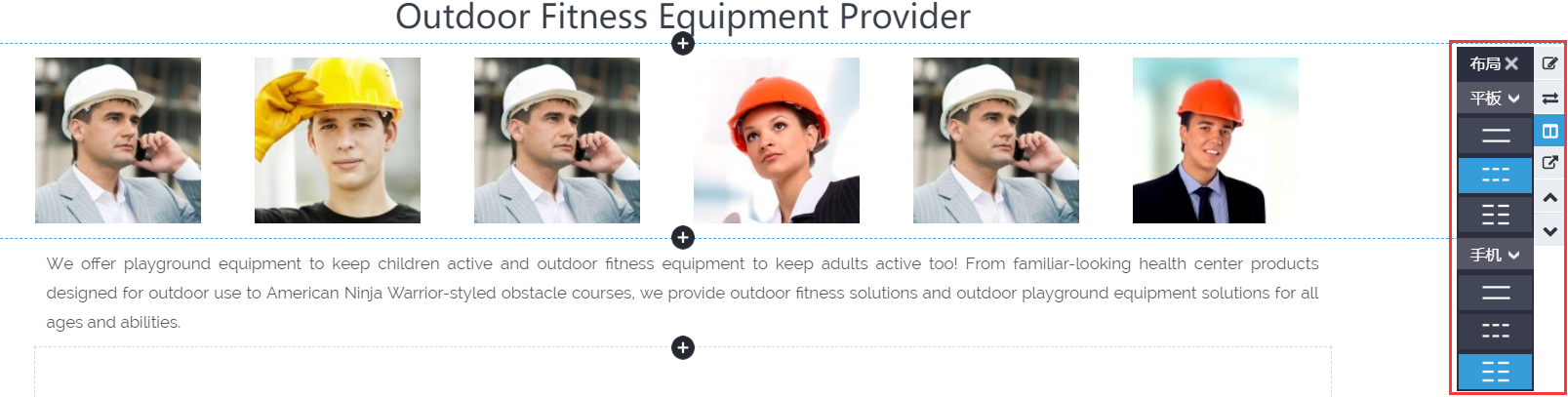 【操作入口】鼠标停留在由多个组件组成的行上,单击鼠标左键,在该行右侧出现“行设置”,点击布局设置即可。举个例子,例如我们在网页端设置一行六列展示,在Pad端设置两行三列展示,手机端设置三行两列展示,效果如下截图所示: