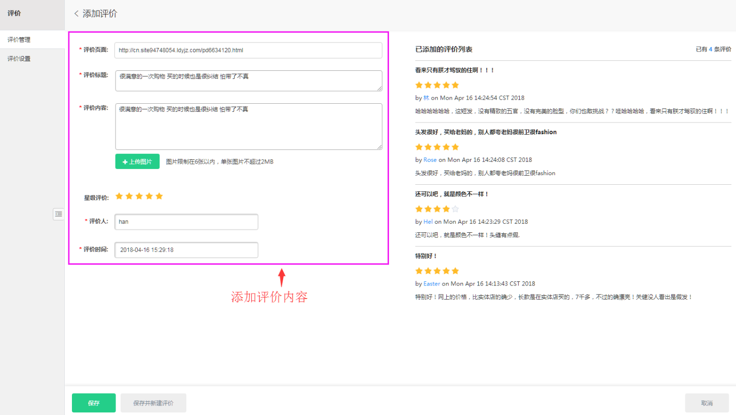 【操作步骤】登录网站后台--》“内容”--》“评价管理”--》“添加评价”,输入相关内容,单击“保存”。