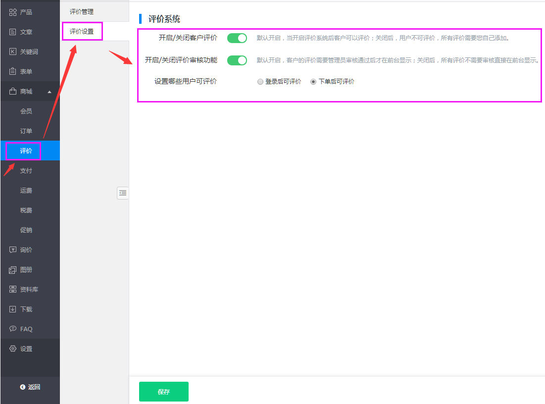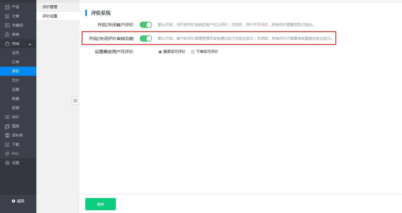 2)支持卖家设置登录后可评价。网站后台设置入口如下图所示: