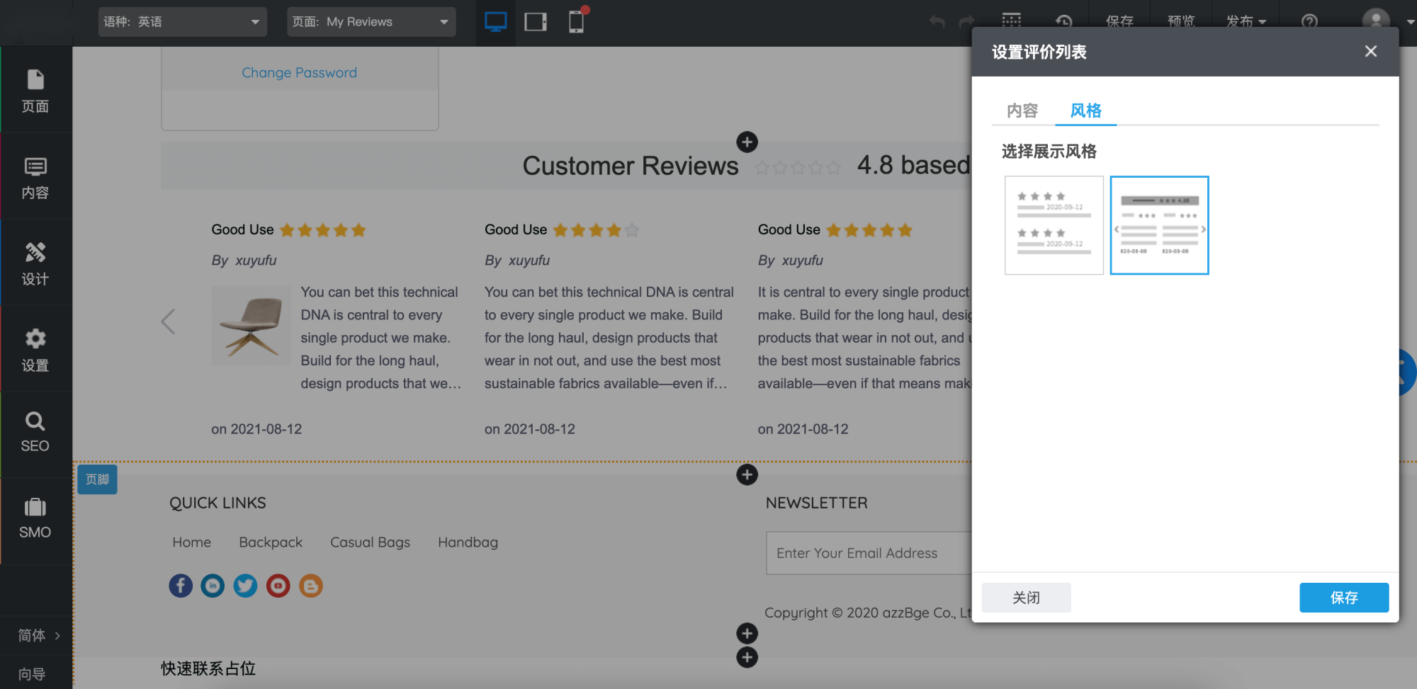 第2步:在产品详情页面的模板页面,添加一个“评价列表”组件;