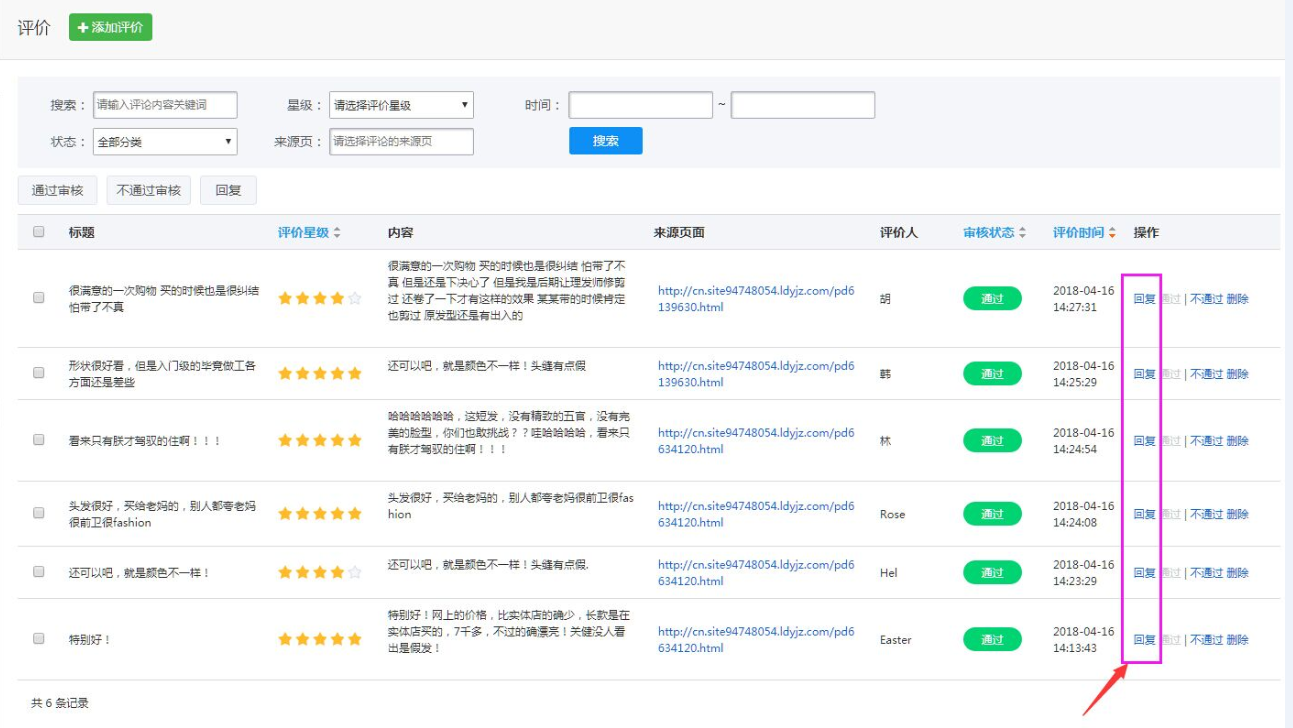 【操作步骤】登录网站后台--》“内容”--》“评价管理”--》“添加评价”,单击某一条评价后面的“回复”按钮。