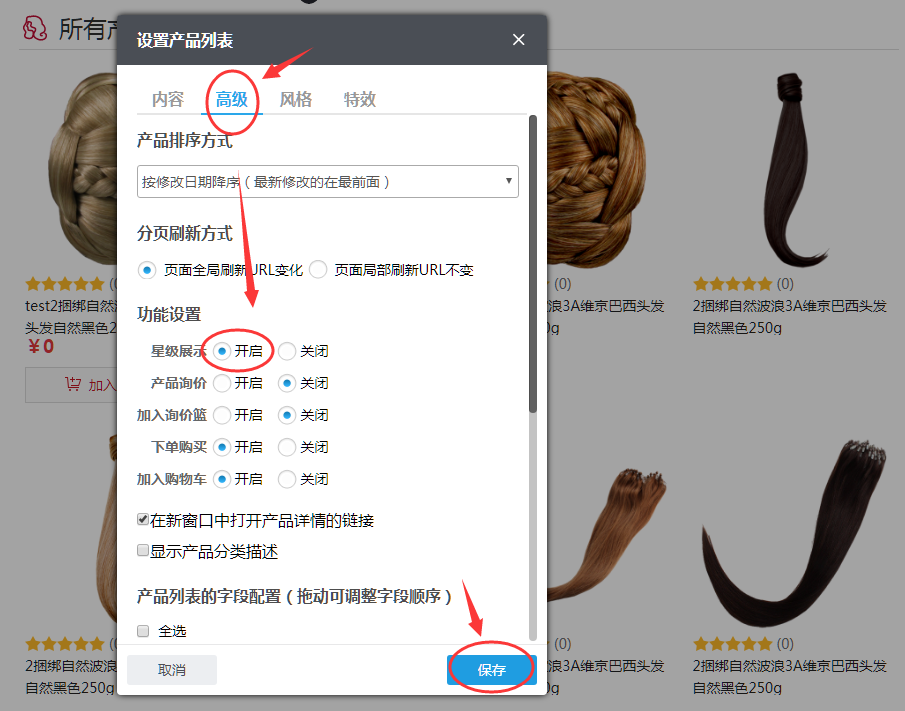 第4步:单击“高级”页签,找到“星级展示”这一项,单击"开启“,然后”保存“;