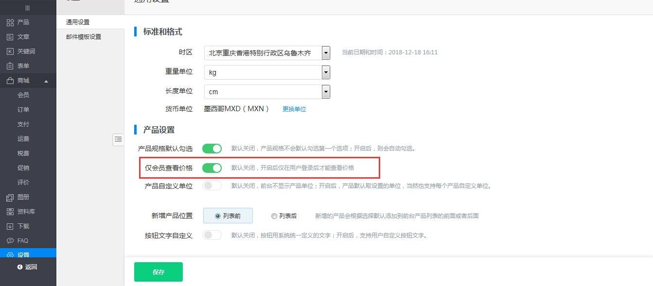 登录网站后台->内容管理->设置中,打开仅会员查看价格的功能,如下截图所示:
