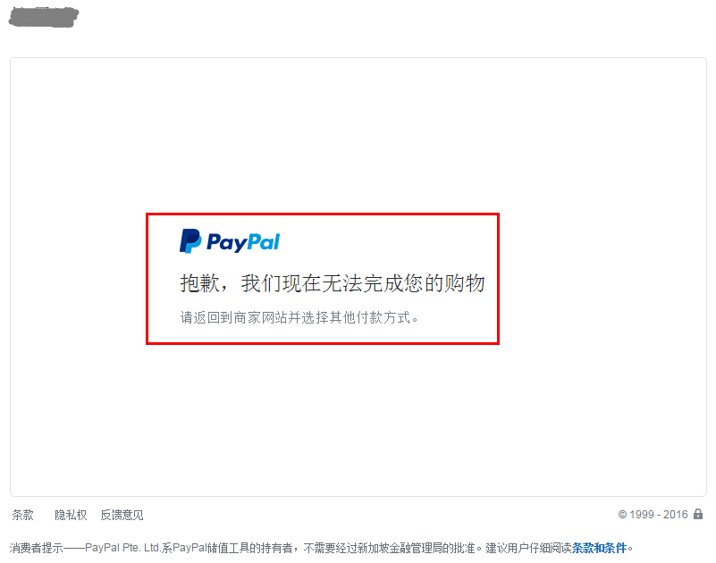 【重要提醒事项】Paypal官方要求收款方和付款方不能同时为中国大陆注册的账号,所以如果在测试或者真实客户购买的环节出现“抱歉,我们现在无法完成您的购物”这样的报错提醒,如下截图所示: