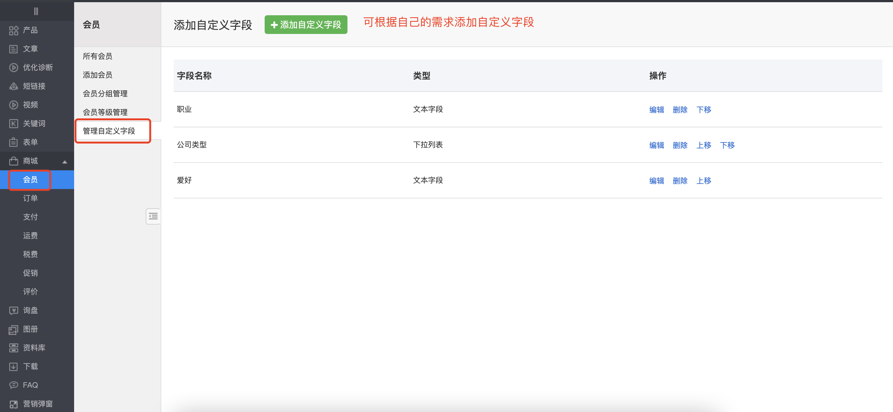 (1)在后台的会员菜单中增加了“自定义字段”页面,可添加/编辑/删除字段,在后台添加会员和前台用户自主注册时填写相应的字段,收集用户信息;