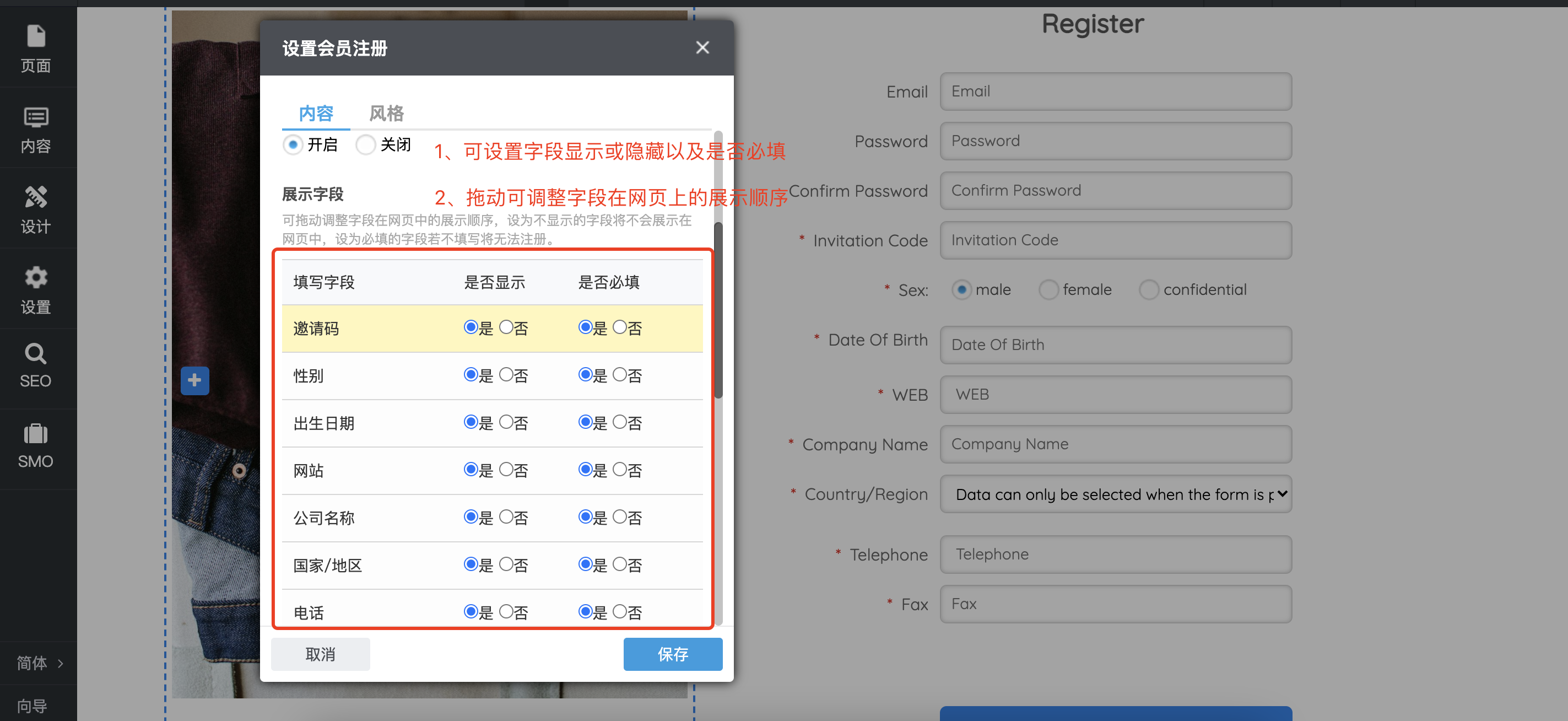 (2)优化了“会员注册”组件的设置页面,可自行设置字段是否显示和是否必填,并支持拖动调节字段在网页上的展示顺序。