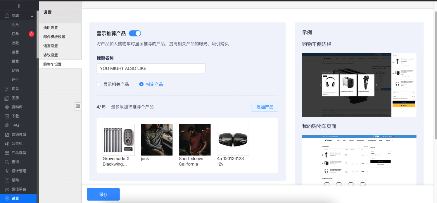 (3)操作步骤:在内容管理后台-设置菜单中,新增“购物车设置”,开启功能后,可填写标题名称并选择展示的产品,提供两种选择产品的方式: