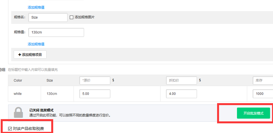 在产品编辑页面,若有需要,可以开启批发模式定价,也可以设置是否对该产品收取税费。如下图所示: