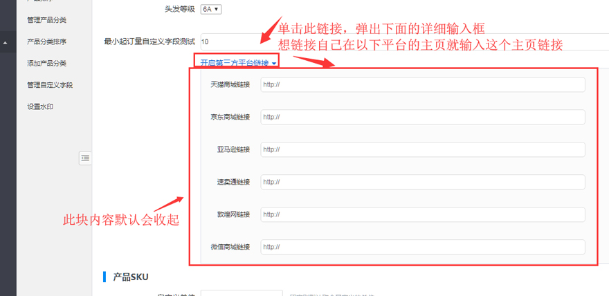 注意:购买企业营销平台套餐用户若开启了支付功能,才拥有“开启在线交易模式”功能,开启了此功能才支持sku功能,若不需要可以关闭。商城网站是默认开启此功能的,没有关闭入口。