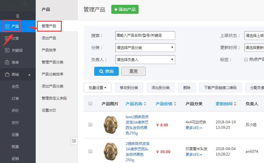(4)单击“产品管理”找到某个产品,进入此产品的编辑页面;