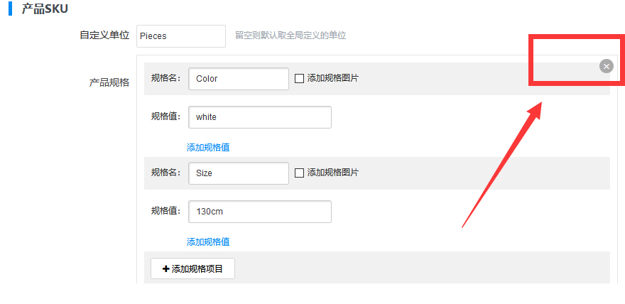 附加说明:如果要删除产品规格其中一个sku,只要点击对应sku后面的“×”即可删除。如下图所示: