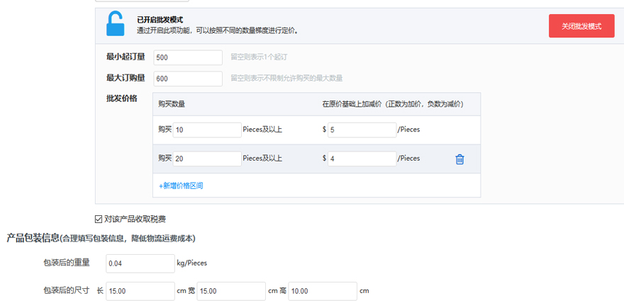 开启批发模式以后,支持设置最小起订量、最大订购量、支持设置批发价格区间。此外我们还可以对产品包装信息进行设置,从而降低物流运费成本。(涉及不到包装的可不填写),如下图所示: