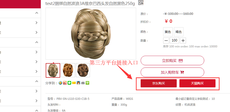 每个产品详情都可以添加各大电商平台的购物入口,为您需要的平台引流;添加好自己在这些第三方平台主页链接以后,是以按钮的形式展示出来,访客单击就可以直接跳转到第三方平台主页。
