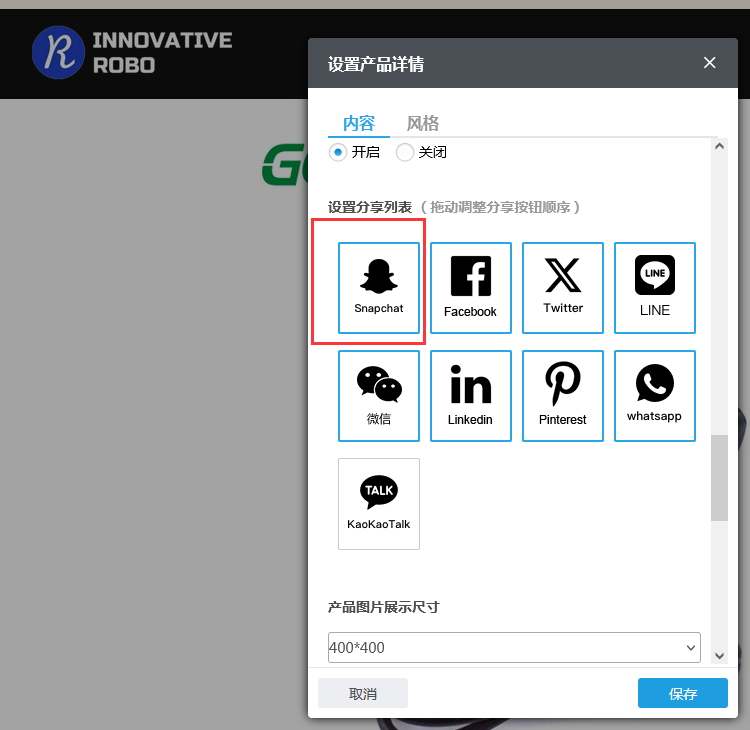 功能介绍:在“产品详情”组件与“文章详情”设置分享列表中选择Snapchat即可将您的产品或文章分享到Snapchat平台,增加产品与文章的曝光度。