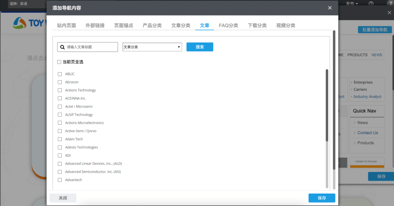 发布功能:快速导航”组件选择“文章详情”作为导航内容,支持通过文章标题搜索或选择文章分类快速选择需要链接的文章页面。